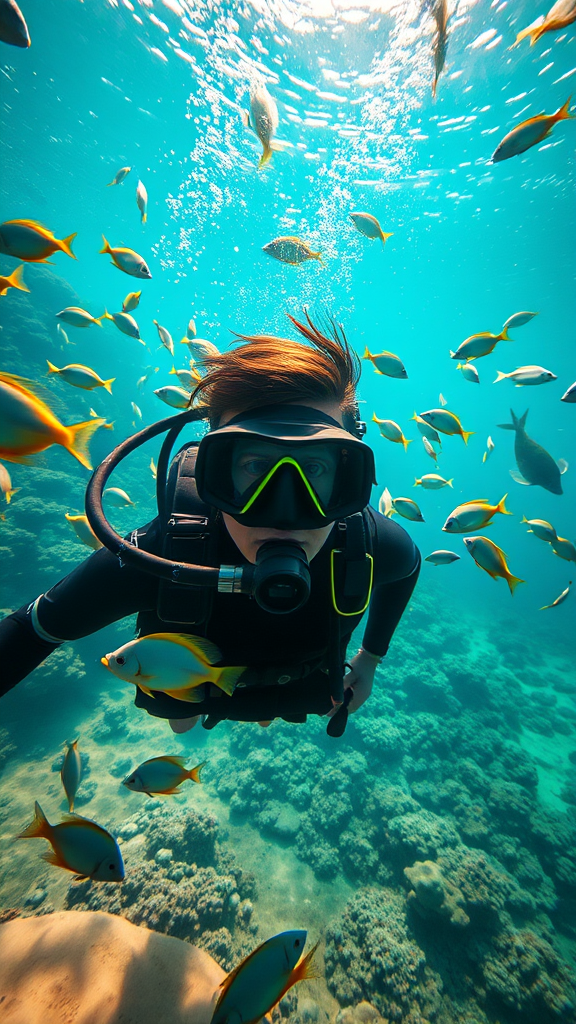 Underwater photographer in crystal-clear waters, surrounded by a kaleidoscope of tropical fish, schools of blue tang and parrotfish weaving past a scuba diver wearing a sleek black and neon green dive mask, breathing regulator visible as the sunlight filters down, teeming marine life on the reef in the background, vibrant hues of turquoise and coral and golden sandy seafloor, distant shadow of a lazy sea turtle gliding effortlessly, temp around 78 degrees Fahrenheit, 1:2 aspect ratio, incredibly detailed and texturized visualization, stylize object and character details to enhance realism, vistas of sunlit ocean stretching out into the deep