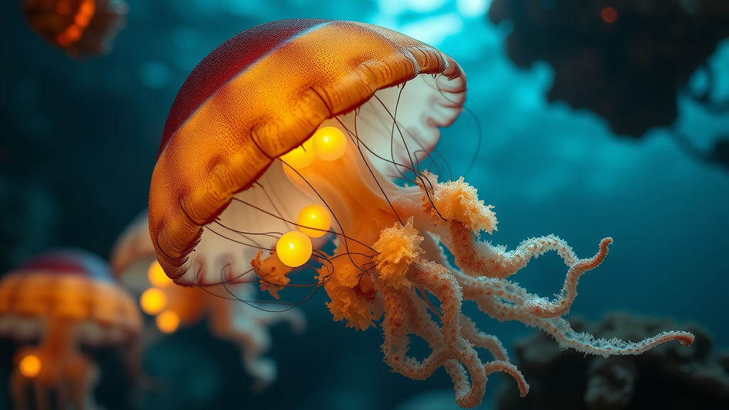 Underwater realm, glowing jellyfish with intricate details, macro shot capturing corals and luminescent bulbs, hyperdetailed with a cinematic touch, complex blurry background, distorted anatomy with bizarre formations, floating limbs and disconnected parts, mutated and grotesque, creating an unsettling yet captivating scene.