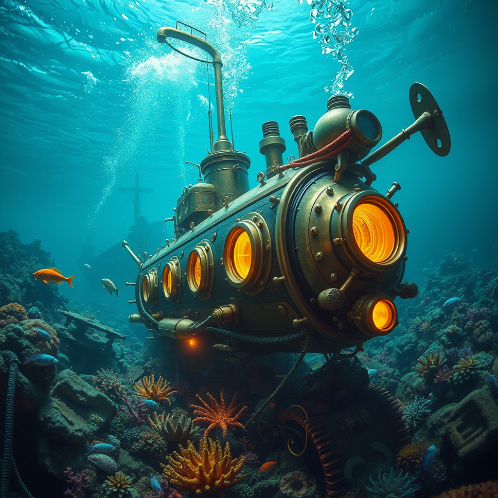 Underwater scene capturing a retro-futuristic steampunk submarine inspired by the Nautilus from Jules Verne's world, with intricate brass gears and portholes glowing softly, surrounded by an ethereal oceanic landscape teeming with colorful marine life and an ancient, mysterious shipwreck partially visible in the background.