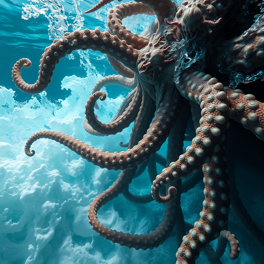 Underwater scene, close up of absurd tentacles amidst crashing waves, intricate and highly detailed textures, cinematic shot emphasizing the side view, smoke and water intertwine in a surreal dance, rendered in 4k and 8k resolution. The image captures both 3D and 2D elements, fused with digital art techniques. While focusing on detailed anatomy and lifelike proportions, there's an intentional artistic distortion. Mutated and abstract forms are featured, with limbs floating or disconnected, blending into the aquatic environment. The composition presents a glitchy yet mesmerizing array, creating a juxtaposition of beauty and the grotesque, with elements purposely blurred for effect. Asian influences subtly permeate throughout the piece, rendered with intentional imperfections to enhance the bizarre and fantastical qualities.