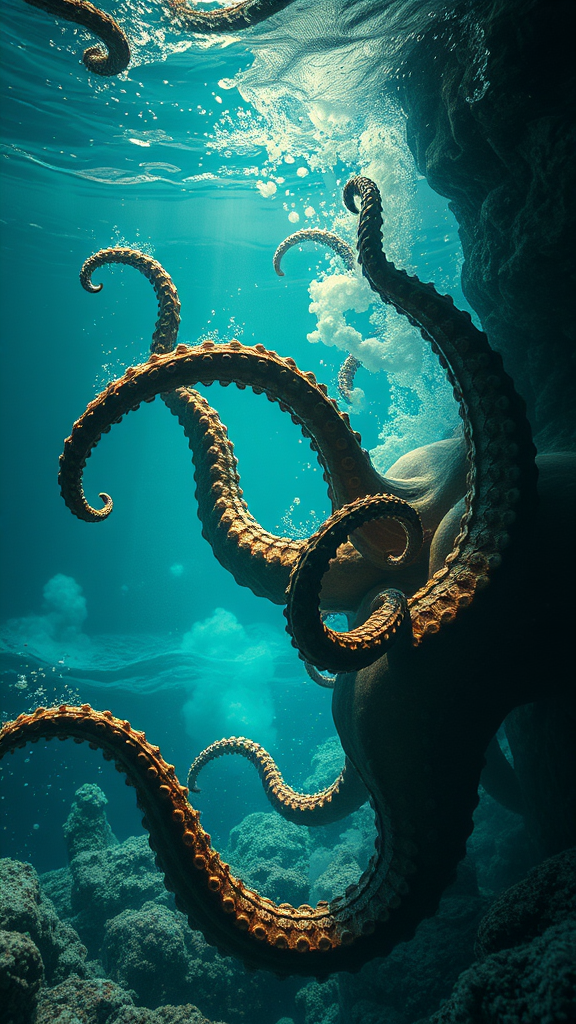 Underwater scene featuring a close-up cinematic shot of waves and water cascading around intricately detailed tentacles. The setting includes the play of light and smoke, rendered in high resolution with 4k and 8k textures, capturing the surreal and absurd atmosphere. The side view offers a richly detailed and highly textured perspective, merging elements of 3D and digital art. The composition intentionally explores themes of mutation and distortion, featuring unusual limb arrangements that create a sense of disconnection and abstraction. This artistic portrayal embraces imperfections with elements of smudgy, glossy textures, and glitchy details, blending a fusion of sketch and painting styles to convey a unique, albeit unsettling, visual narrative.