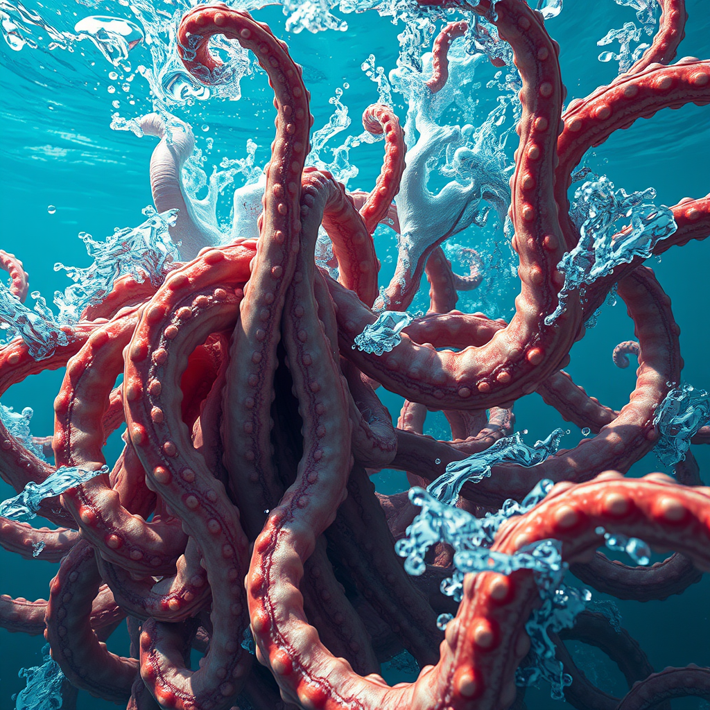 Underwater scene featuring a close-up of surreal tentacles intertwined with cascading waves, capturing the dynamic motion of water. The image boasts high-resolution details in 4k and 8k, with an emphasis on intricate textures and a cinematic perspective from the side. The composition blends both 3D and 2D elements, seamlessly integrating sketch-like qualities with digital art techniques. Despite its detailed textures, the art intentionally features distorted anatomy, with floating and disconnected limbs, to evoke a sense of mutation and absurdity. The overall style is glossy with a hint of glitchiness, portraying an eerie yet captivating scene. Elements of fused body parts and unusual proportions add to the mysterious and dreamlike ambiance.