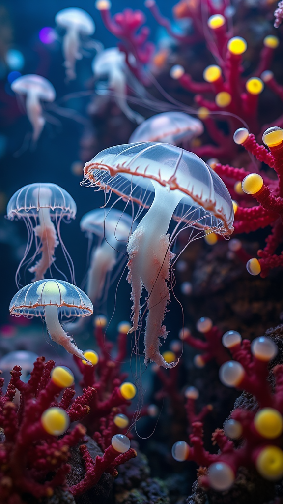 Underwater scene showcasing an intricately detailed macro shot of glowing jellyfish surrounded by vibrant corals and luminous bulbs. The atmosphere is hyper-detailed with a cinematic feel, featuring a complex, blurry background. The jellyfish and corals exhibit unusual anatomy with floating, disconnected limbs and elements that appear mutated and oddly fascinating, blending beauty with bizarre, creating an unsettling yet captivating visual.