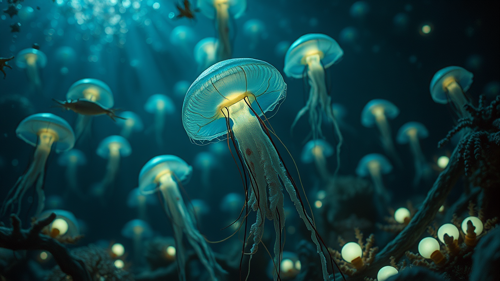 Underwater scene with glowing jellyfish and corals, macro shot, intricate details, luminescent bulbs, hyperdetailed, cinematic feel with a complex blurry background, poorly drawn elements, incorrect anatomy, missing or floating limbs, disconnected limbs, mutated, eerie, unsettling, grotesque features.
