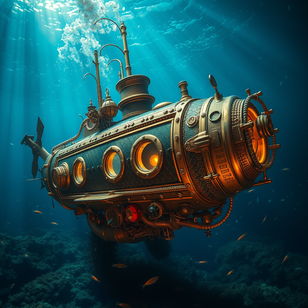 Underwater wide shot of an intricately designed steampunk submarine gliding through the deep sea, featuring ornate brass and copper elements, with glowing portholes illuminating the ocean depths, accompanied by a vibrant array of colorful marine life weaving in and out of the submarine's path. Inspired by the iconic Nautilus from Jules Verne's tales, but reimagined with dragon-like scales adorning its hull and propeller-powered mechanical tentacles gently swaying, surrounded by shafts of sunlight filtering through the water, casting mystical patterns on the seafloor.
