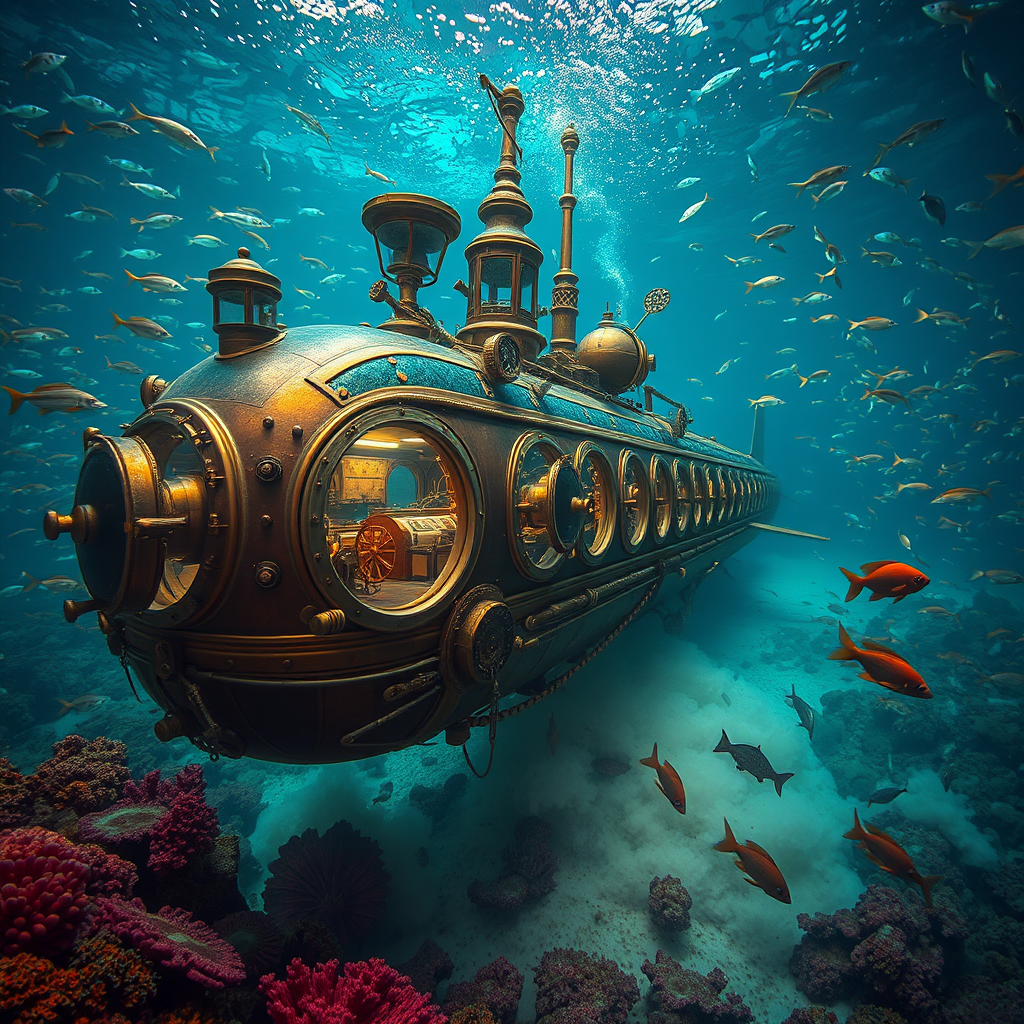 Underwater wide shot of an intricately detailed steampunk submarine, resembling the Nautilus from Jules Verne's tales, surrounded by shimmering schools of bioluminescent fish, with ornate brass and copper machinery visible through glass portholes and propellers gently stirring up clouds of vibrant coral sand.