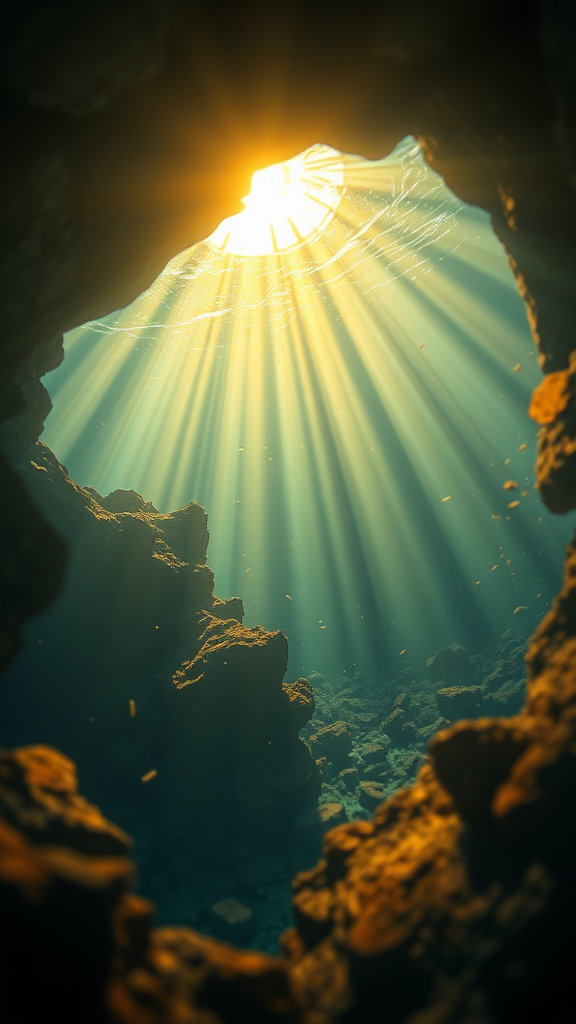 Underwater:4 Atlantis, caustics and Snell's window, god rays breaking through the surface, remnants of a lost civilization, cinematic still, dramatic lighting, rich color grading, cinematic bronze hues, artistic masterpiece, intricately detailed cartoon, subtle blur, abstract forms, 3D rendered, Blender-crafted.