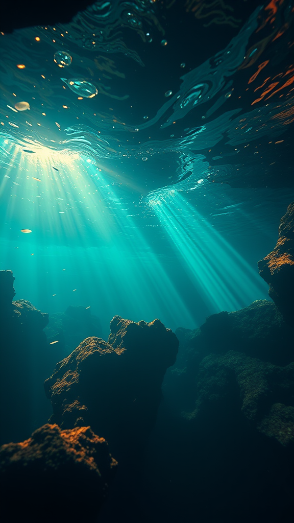 Underwater:4 Atlantis, caustics, Snell’s window, divine beams, remnants, still image, filmic lighting, color enhancement, cinematic amber, masterpiece, elaborate, highly detailed animation, soft focus, abstract forms, 3D, Blender.