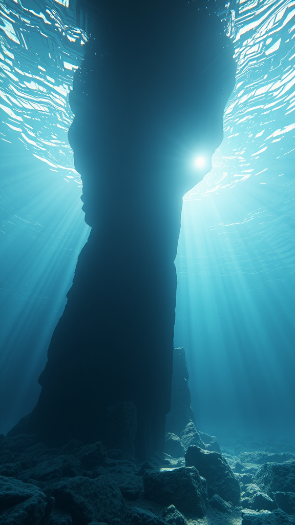 Underwater:4 Atlantis, caustics, Snell's window, god rays, remnants, serene scene, cinematic lighting, expert color grading, cinematic amber, masterpiece, intricate and highly detailed animation, soft focus, abstract, 3D rendering, Blender.
