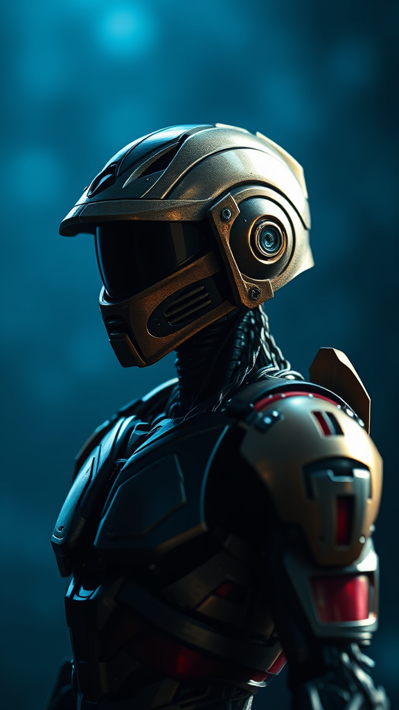 Underworld robot adorned with a reflective helmet, reminiscent of the iconic Halo Master Chief armor, with an intricate design featuring shades of bronze, deep red, and jet black. The robot stands silhouetted against a softly blurred backdrop, where cool blue tones create a bokeh effect that adds depth and mystique to the scene. The overall environment is shadowy and atmospheric, enhancing the epic and moody ambiance. Elegant and powerful, the robot embodies a fusion of art and technology, set to embark on an otherworldly adventure.