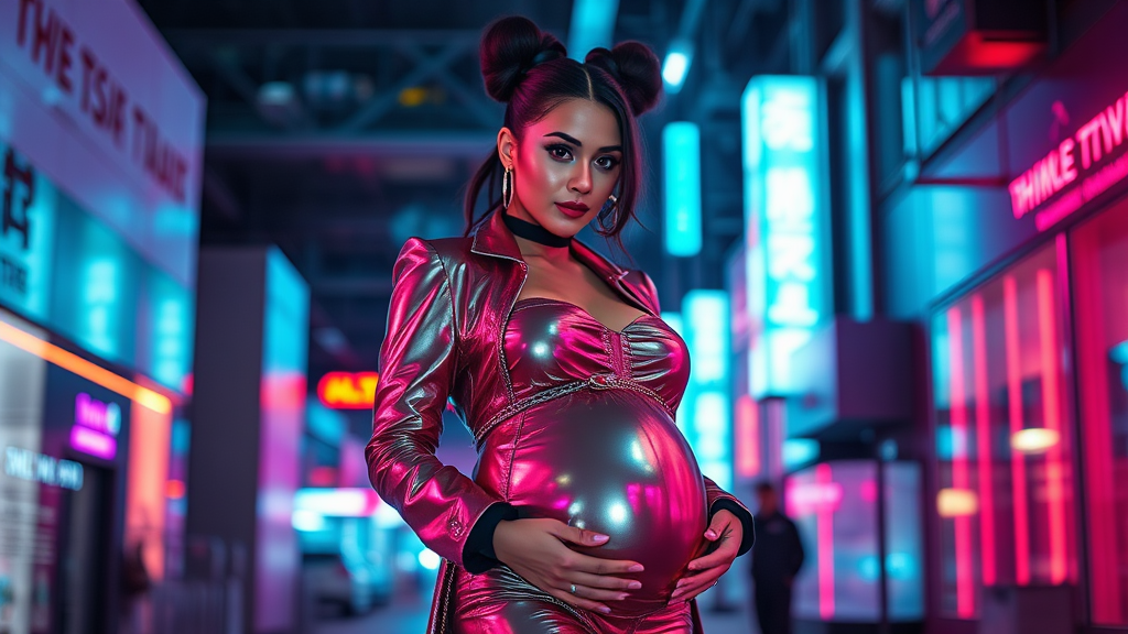 Unique futuristic cyberpunk-inspired maternity photoshoot with innovative elements; featuring vibrant neon colors and sleek metallic textures; female Instagram influencer showcasing bold fashion; captured with a Canon 5D camera; high-impact visual composition with emphasis on dynamic lighting and atmospheric effects; urban setting with high-tech architecture and abstract digital motifs; creative twist with a touch of whimsy and unexpected props; styled for sophistication and avant-garde appeal; ambiance blending mystery and modernity.