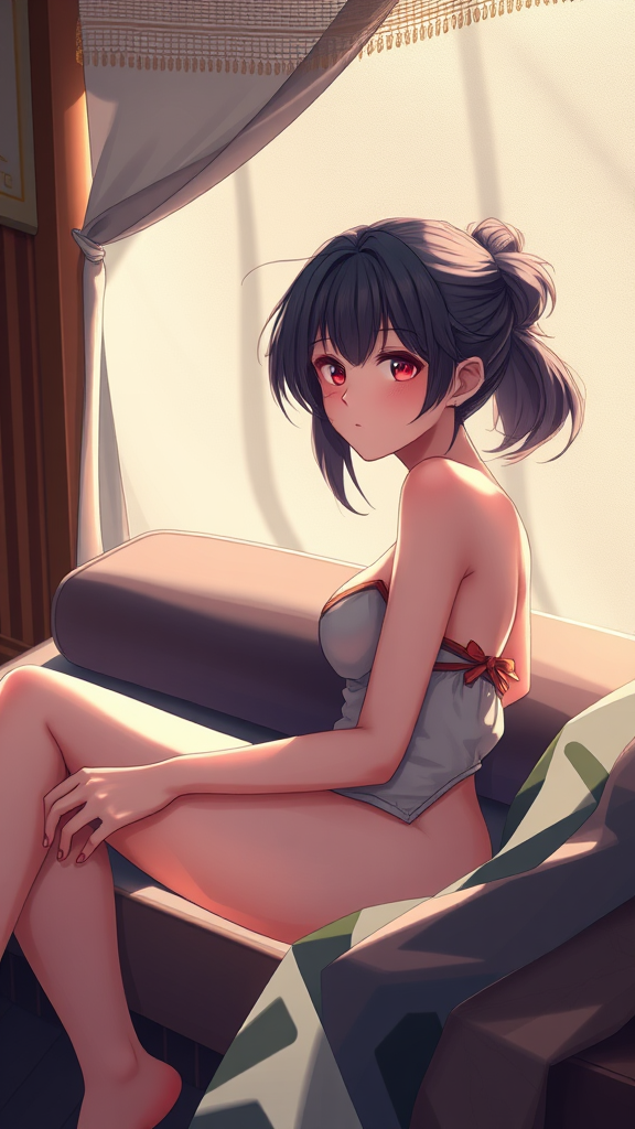 Unity 8k wallpaper, ultra detailed, beautiful and aesthetic, perfect lighting, featuring a dynamic pose and angle, with a focus on a slender figure and medium-sized features. The scene captures a sense of realism with a detailed background and a perfectly detailed face, showcasing expressive eyes and a subtle blush. The setting includes a bolster, conveying an ambiance of tranquility as the subject rests. The image draws inspiration from Bad-Artist-Anime's style, ensuring every element from the pose to the setting is captured with high detail. Enhancements in lighting and composition elevate the visual, making it immersive and captivating, while avoiding any visual inconsistencies or unrealistic elements.