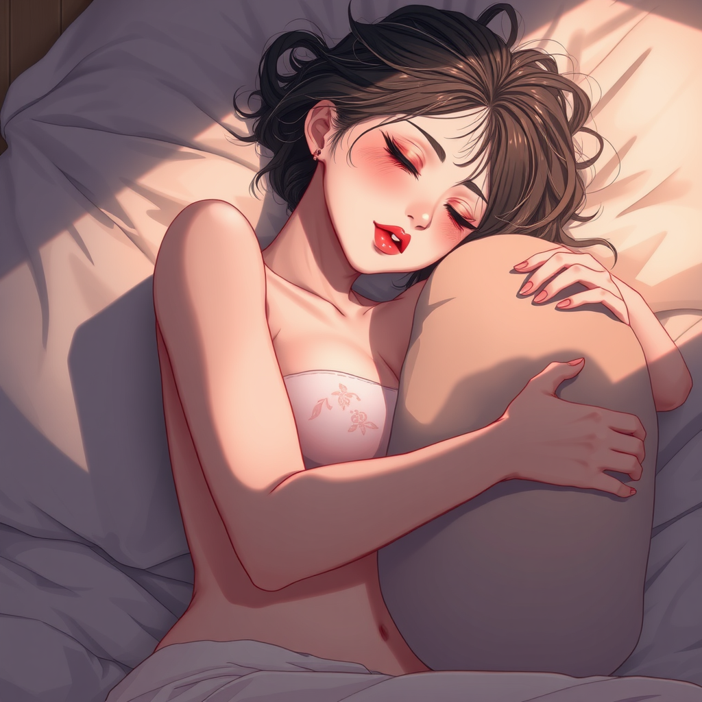 Unity 8k wallpaper, ultra detailed, beautiful and aesthetic, perfect lighting, featuring a person in a dynamic pose and angle, wearing lipstick, with a slim body and medium bust, set against a detailed background, realistic elements, solo depiction, with a perfectly detailed face, detailed eyes, and a blush accent, holding a bolster while appearing asleep. Art style inspired by bad-artist-anime and bad-artist. Includes elements to correct anatomy like bad-hands, yet removing unnecessary features like extra limbs and avoiding distortions such as low resolution or watermarks.
