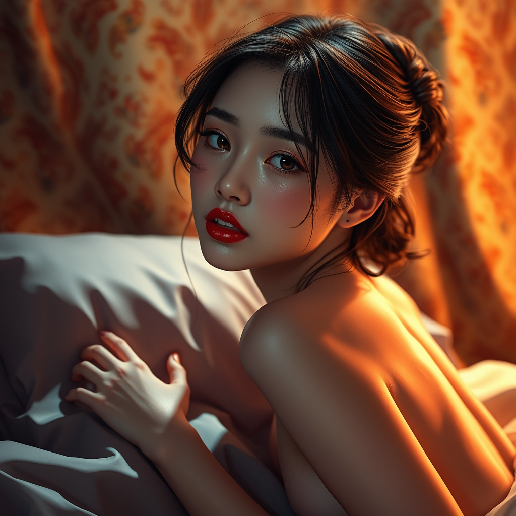 Unity 8k wallpaper, ultra detailed, beautiful and aesthetic, perfect lighting, featuring a dynamic pose and angle, highlighted by striking lipstick on a slender form with medium curves. Set in a richly detailed background, the image focuses on a solo subject with a perfectly detailed face, captivating eyes, and a touch of blush. The scene includes a bolster and conveys a sense of serene restfulness, inspired by bad-artist-anime, while aiming for a realistic portrayal without imperfections like bad hands. The image emphasizes artistic quality, avoiding elements like low resolution, watermarks, or unnecessary limbs.