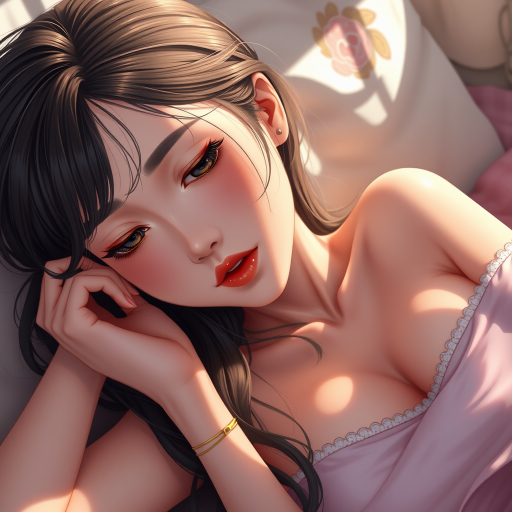 Unity 8k wallpaper, ultra detailed, beautiful and aesthetic, perfect lighting, dynamic pose, dynamic angle, lipstick, slim body, medium breasts, detailed background, realistic, solo, perfect detailed face, detailed eyes, highly detailed, blush, bolster, sleeping, inspired by anime artistry, vibrant color palette, subtle shadows, enhancing the elegance, no extra limbs, seamless integration, expressive features, captured moment of serene beauty.