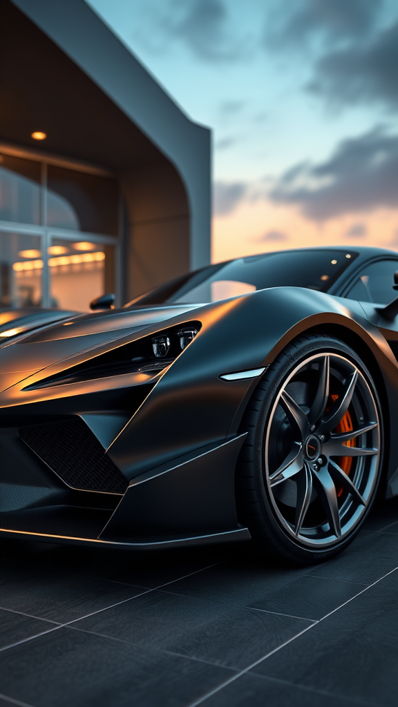 unreal engine 5 rendering of a 2023 supercar, matte black paint with chrome silver accents, dusk showroom setting with dramatic lighting, low-angle front view showcasing aggressive aerodynamics, highly detailed realistic tire treads, and precision-cut alloy wheels with subtle reflections; 8k, 16k, and 4k resolution options available, showcasing the power of ray tracing and reflections; photorealistic level of detail, from the intricate stitching on the seats to the subtle fade on the carbon fiber elements, captured in stunning 1080p and 4k formats.