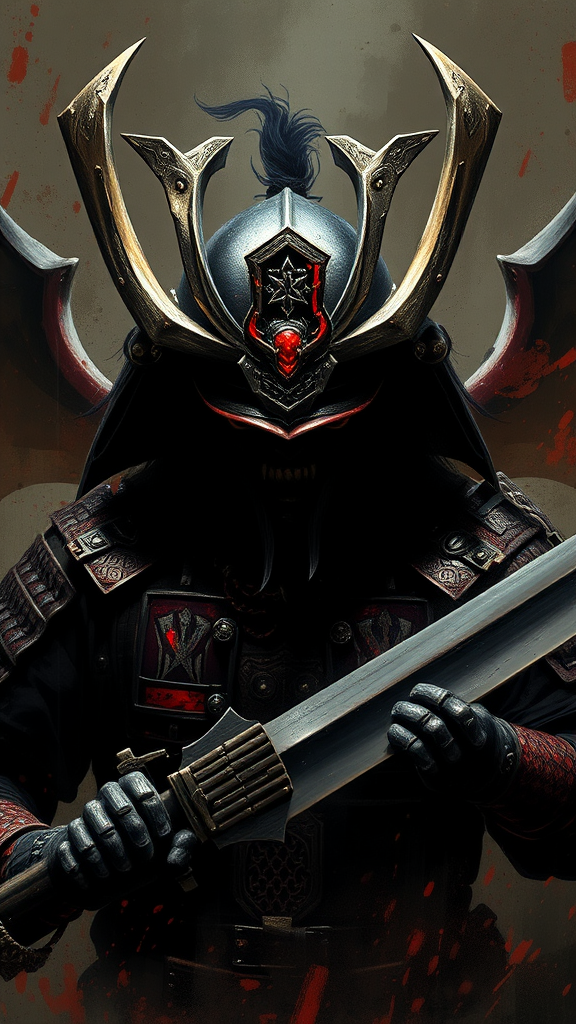 Unstoppable demonic samurai in full battle armor, fierce and faceless, exudes raw power and menace, dynamic and intense composition, digital painting, with a dramatic and somber mood, emotionally rich and profound, set in deep, shadowy tones, high quality, high resolution, leaving a lasting and haunting impact on the viewer, unforgettable masterpiece, evokes deep emotions and introspection, avoiding low quality elements such as blur, plastic look, graininess, duplication, poor drawing, anatomical inaccuracies, and unwanted text or markings like signatures or watermarks, ensuring seamless and polished presentation.