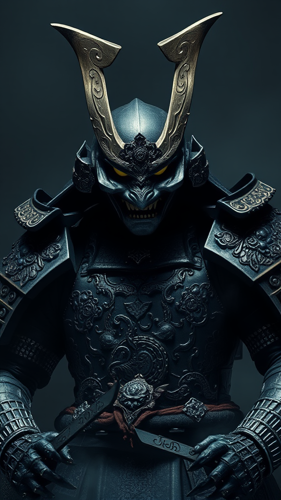 Unyielding demonic samurai in ornate battle armor, imposing, featureless visage, fierce composition, digital artwork, moody, ominous, deeply moving, powerful, and brooding dark hues, exceptional quality, high resolution, leaving a lasting and haunting impression on the mind, unforgettable, masterpiece, with emotional intensity subtle, out of focus, plastic-like, gritty, redundant, poorly constructed, anatomy, limbs, disproportionate, text, label, marks, signatures, logos, autographs, brands, lowest quality, compression flaws, incomplete, obscured, flawed anatomy, awkward body, distorted face, irregularities.