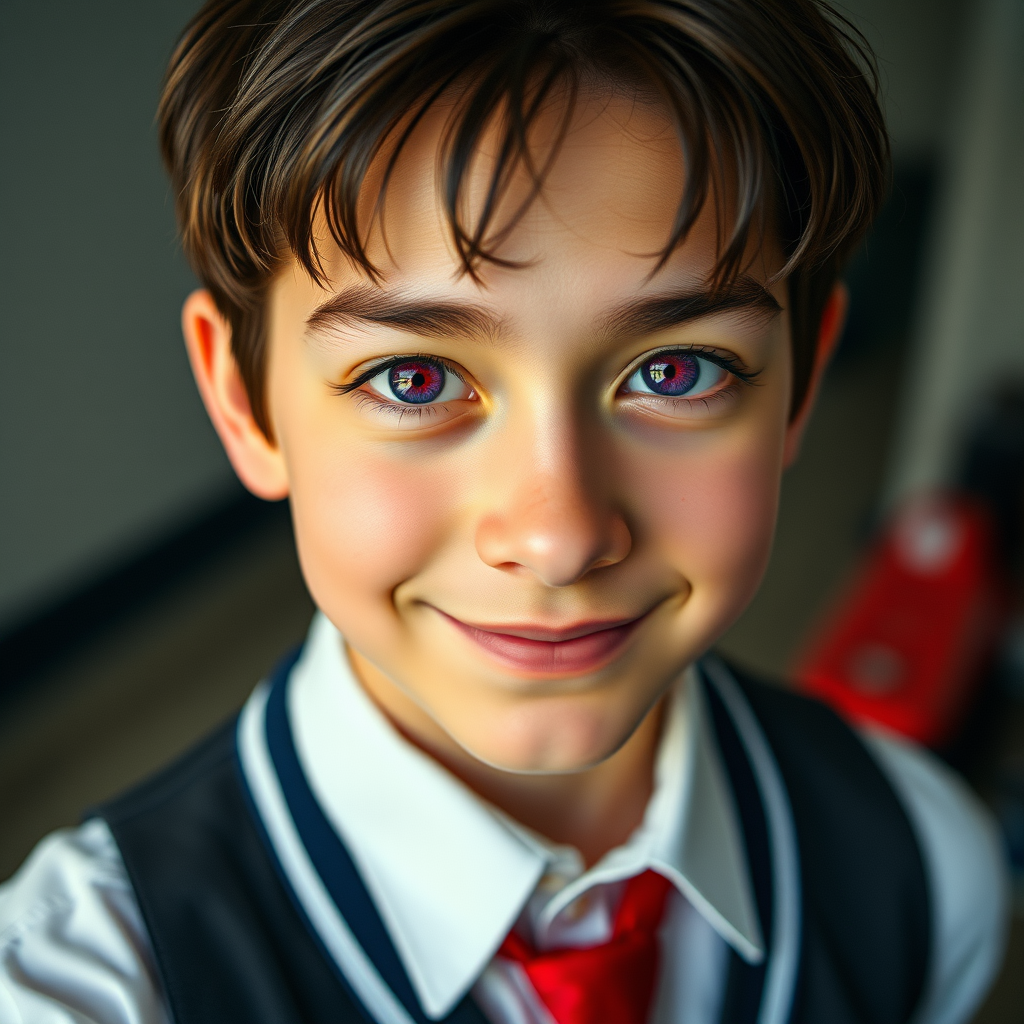 up-close portrait of a young man with purple eyes and a smirk, wearing a school uniform. The image features a dynamic pose and scene captures a sense of energy. However, the composition is imperfect with low resolution, evident jpeg artifacts, and parts of the image are cropped out of frame. Despite these, some unique qualities such as noticeable gradients and an overall low quality give the image a distinct character. The scene primarily focuses on the boy, leaving the background minimalist, and adding a slightly blurry effect for an engaging aesthetic.