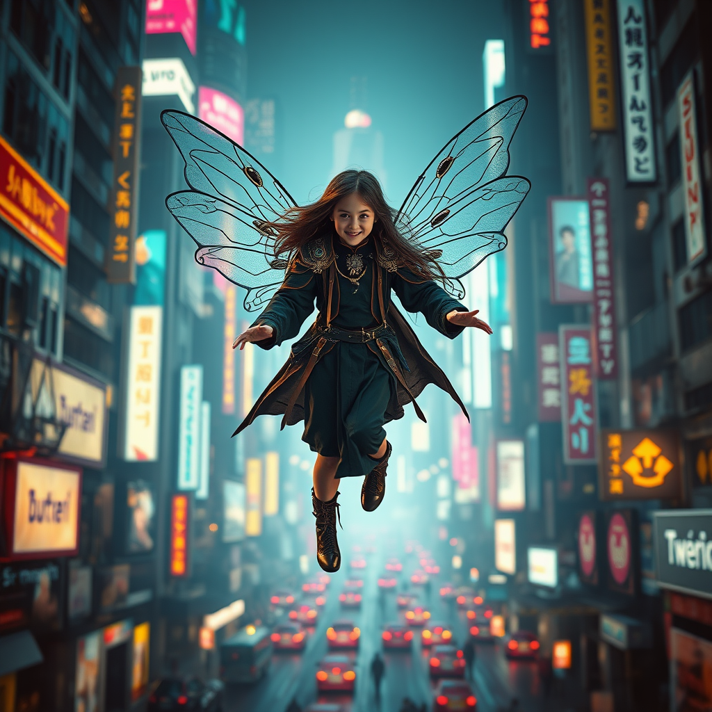 Upper body front view shot of a young, energetic figure with a small stature and long hair, captured in a cinematic and dynamic pose. The character is centered and appears happy and elegant, soaring through a detailed cyberpunk cityscape. They wear fantastical priest attire adorned with intricate accessories and fairy wings. The ultra-detailed city background is bathed in vibrant neon and volumetric lighting, enhancing the scene’s dynamic and cinematic quality. The composition is a masterpiece of professional work with a cohesive blend of soft yet striking studio lighting. The aesthetic draws inspiration from Carne Griffiths, focusing on a sense of freedom and whimsy amidst the futuristic urban environment. The portrait maintains clarity with a focus on natural proportions and expressive features, ensuring a seamless integration into the bustling cityscape.