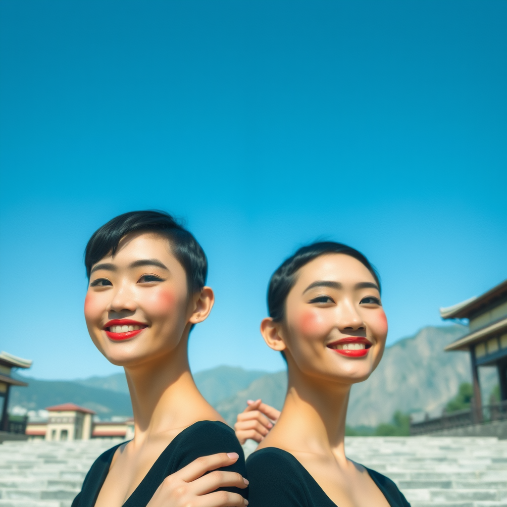 upper body portrait, smiling face, rosy cheeks, outdoor setting, daytime, minimalist background, clear blue sky, short hairstyle, scenic view, cultural architecture, direct gaze, stone steps, mountainous backdrop, atmospheric lighting, ultra-high-definition, high dynamic range, artistic interpretation, two similar figures, artistic transformation, unique expressions, playful eye alignment, elegant neck, graceful hands, sharp focus, center frame, crisp details, seamless quality, distinct imagery, cohesive composition, sophisticated aesthetics.