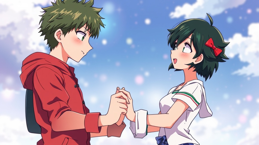 Uraraka Ochako and Izuku Midoriya gently holding hands in a tender moment, set in the world of Boku no Hero Academia, portrayed with a high-definition ultra-realistic style. Their expressions convey warmth and connection, surrounded by a vibrant background that highlights their bond. The setting emphasizes their heroic journey, capturing their youthful energy and determination through intricate details and natural poses. The image is free of distortions, focusing solely on their relationship and individual personalities.