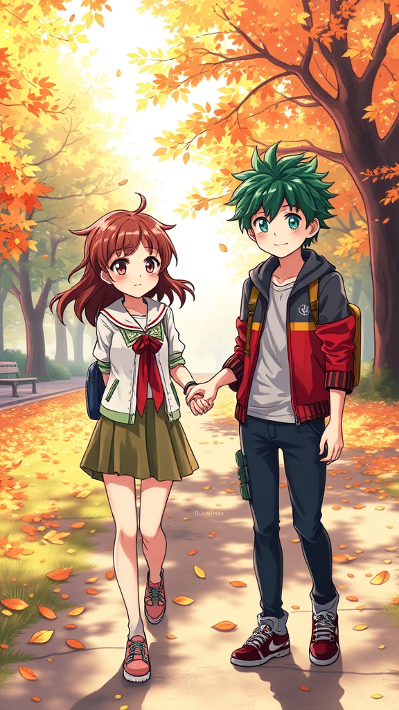 Uraraka Ochako and Izuku Midoriya holding hands from Boku no Hero Academia, HD, ultra realistic, vibrant and detailed setting, surrounded by a serene park setting in early autumn, leaves gently falling around them, soft sunlight filtering through the trees casting playful shadows, both characters showing expressions of happiness and hope, their costumes looking slightly windswept as if they've just finished an adventure, the scene capturing a moment of genuine connection and friendship, displaying a sense of calm and warmth, avoiding any unusual distortions or additional elements, no other characters present, focus on the pair and their interaction.
