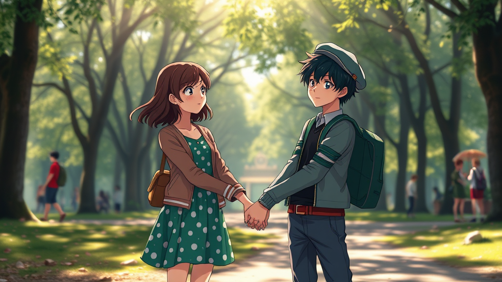 Uraraka Ochako and Izuku Midoriya standing together in an enchanting park scene, their hands gently clasped, Boku no Hero Academia style, ultra-realistic with vibrant colors, depicting a serene atmosphere, soft sunlight filtering through the trees casting playful shadows on the ground, creating a sense of warmth and tranquility, their expressions portraying a deep bond and mutual support, a picturesque moment capturing the essence of friendship and camaraderie, background characters subtly blending in, maintaining focus on the duo, evoking a sense of adventure and promise, free from distractions or imperfections, high quality and richly detailed.
