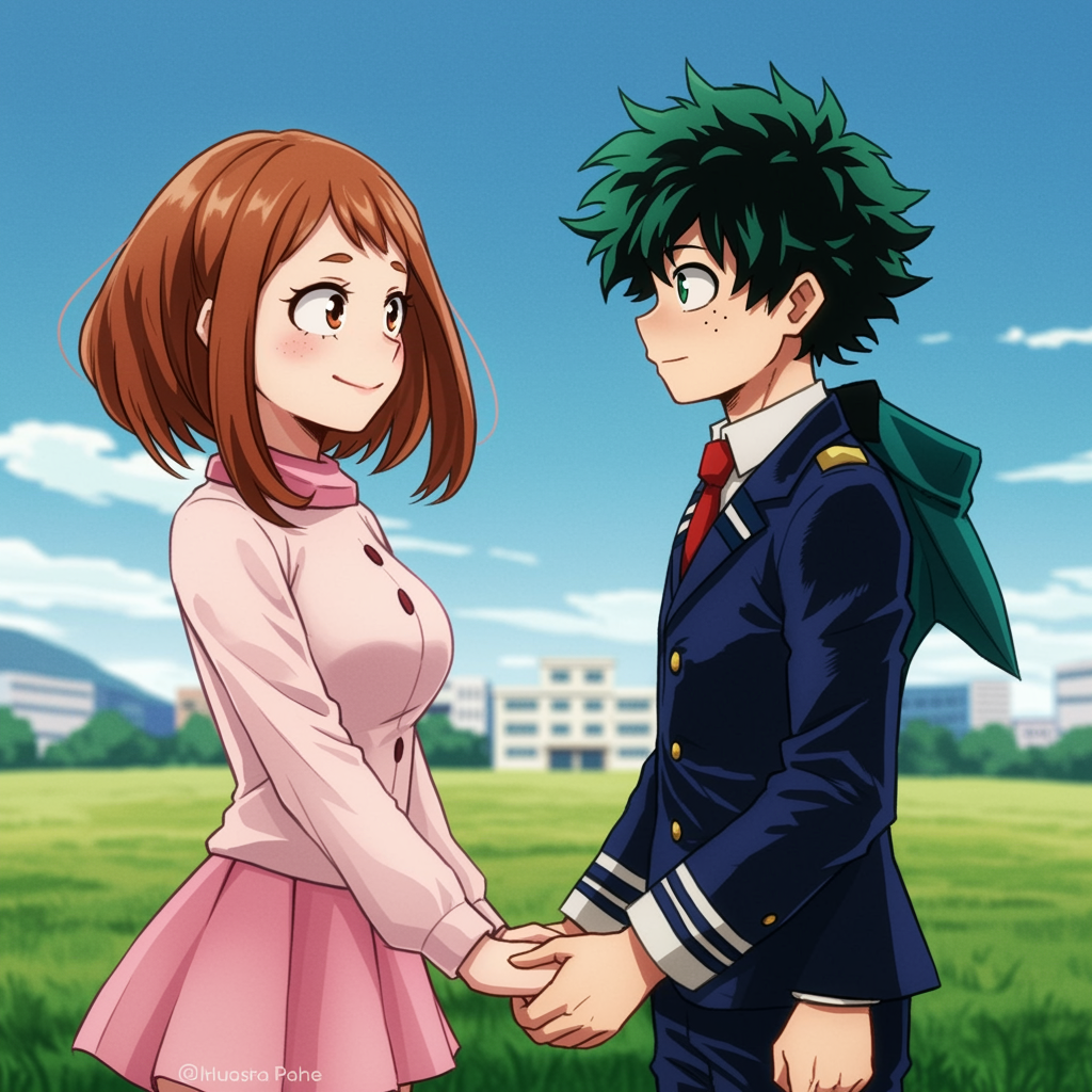 View this AI-generated image featuring uraraka ochako and izuku midoriya standing together holding hands boku no hero academia hd ultra realistic vibrant details focused expressions background with subtle colors gentle lighting natural pose close up soft smiles connection character closeness peacefu