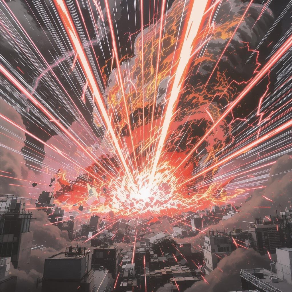 Urban annihilation in the style of Tsutomu Nihei, intricately detailed with beams of energy raining down from above. Depict a city being obliterated by intense, radiant laser impacts from the sky. Capture the accelerating, blinding flashes of light as they strike with immense speed. Render this scene with an anime aesthetic and intricate manga graphics in ultra-high resolution, preserving the dynamic intensity and chaos of the event.