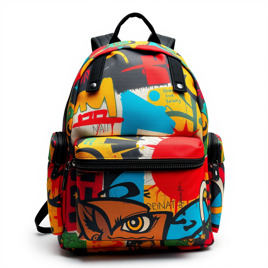 Urban backpack photography inspired by Jean-Michel Basquiat's design, featuring vibrant and intricate patterns with bold, colorful graffiti-like textures. Captured on a clean white background, showcasing high-definition detail in 4K resolution with glossy, dynamic lighting that highlights the textured fabric and unique artistic elements of the design.