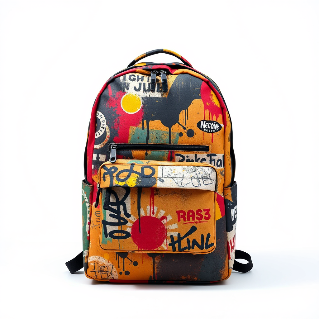 Urban backpack photography inspired by Jean-Michel Basquiat, featuring vibrant abstract designs and graffiti influences, with an intricately detailed texture, showcased on a pristine white backdrop, high-definition 4K quality, capturing the essence of contemporary street art through a modern lens.