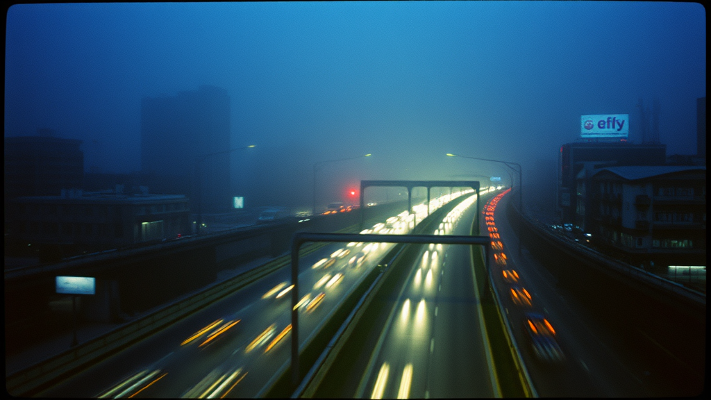 Urban landscape scene captured on vintage 35mm film, shot from a bridge overlooking a bustling highway, featuring streaks of motion-blurred lights from speeding cars below, bathed in the deep hues of the blue hour, with a distinct grainy texture adding to the cinematic feel, and a subtle fog enhancing the mood.