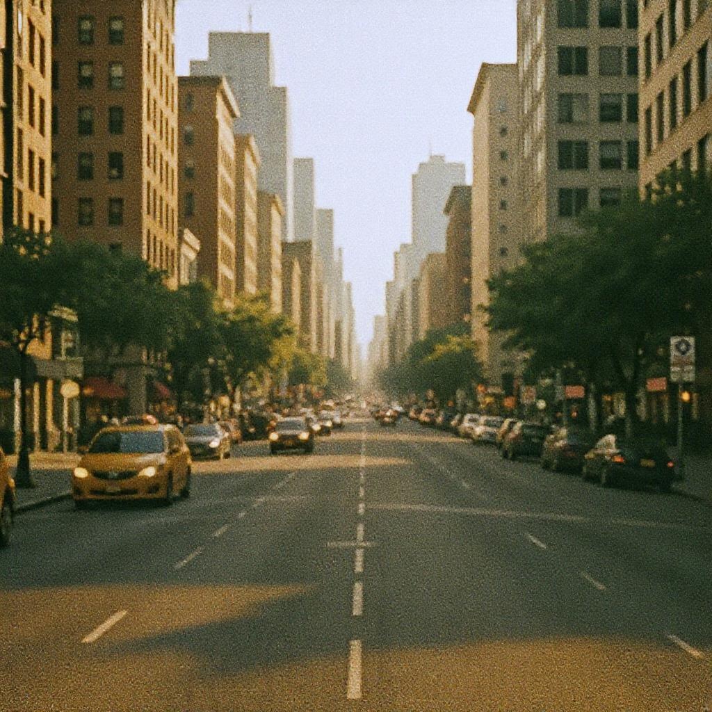 Urban scene captured on film, vibrant city streets bathed in warm daylight, subtle grain adding character, capturing the hustle and bustle with a timeless, nostalgic feel.