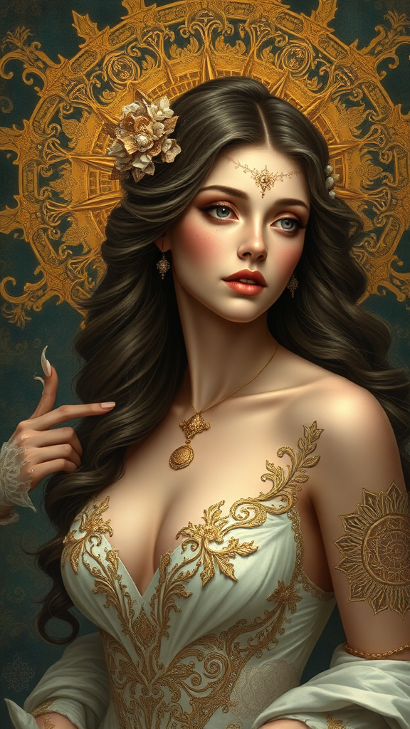 Use the golden ratio to envision the most beautiful model, exhibiting an intricate and elegant design, with a highly detailed digital painting style evocative of artstation concept art. The artwork should be smooth with sharp focus, combining the illustrative styles of Artgerm, Greg Rutkowski, and Alphonse Mucha. Capture the essence of 8k quality without compromising on clarity, avoiding elements like low resolution, text, or compression artifacts. Ensure perfect anatomy and proportions, steering clear of disfigurements such as extra or missing limbs, distorted features, or mutations. The portrait should reflect a harmonious and well-composed masterpiece, with balanced elements and a refined appearance.