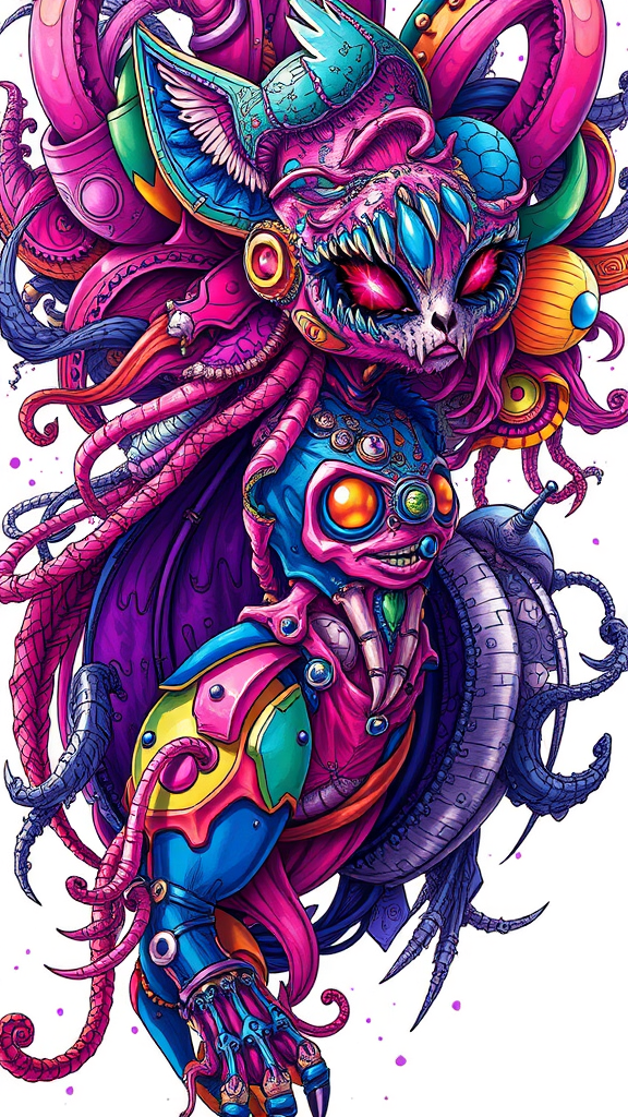Use this prompt as major inspiration: extreme detailed, colorful, highly detailed, optical blending, playful designs, vibrant texture, rich hues, distinct visual effect, high-resolution, intricate, inspired by Carne Griffiths, and monochrome elements. However, avoid incorporating NSFW themes, overexposure, text, watermarks, or any distortions like bad anatomy, multiple limbs, fused body parts, exaggerated features, duplication, or elements that would result in an unpleasant visual effect. Instead, emphasize unique design, stylized forms, and vibrant aesthetics without deformities, while incorporating geometry and abstract themes for a harmonious composition.