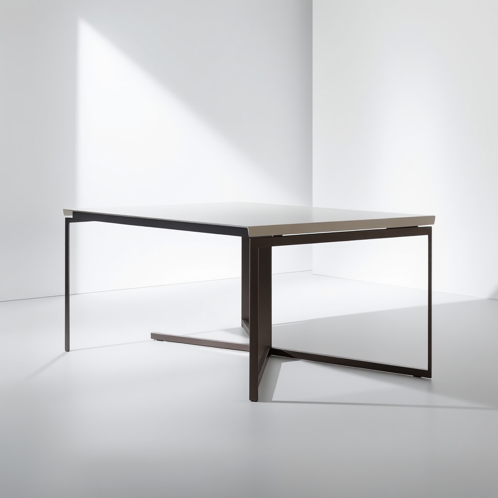 USM Haller Table elegantly captured in a sophisticated photo studio setting, shot with a Fujifilm GFX 100S and a GF 80mm f/1.7 lens. The table's sleek design and polished surface are highlighted in an ambiance that emphasizes its minimalist aesthetic and craftsmanship, enhanced by soft, diffused lighting that accentuates the table's refined contours and modern elegance.