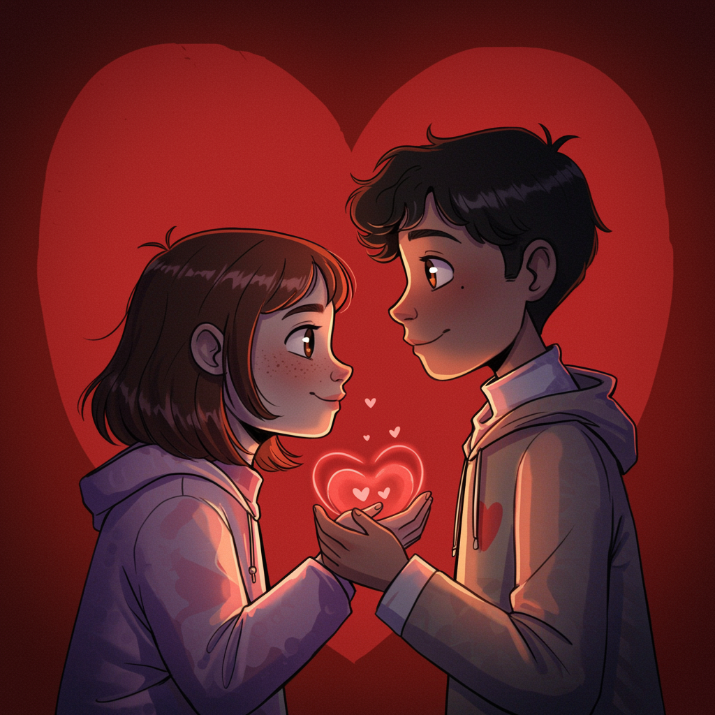 Valentine composition, blending graphic novel style with sketchfab aesthetics, inspired by Fernando Amorsolo's warmth, capturing relatable and heartfelt personalities reminiscent of Alexander Millar's works, featuring a cute and dreamy atmosphere, embodying the essence of a lit kid, with a vertical orientation and a strong stylized approach.