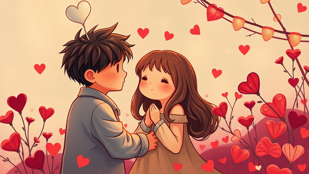 Valentine design in the style of graphic novel inspired illustrations, blending the atmospheric art of Fernando Amorsolo and the endearing charm of Alexander Millar, featuring a relatable and whimsical personality. This concept captures a cute and dreamy essence with a lit kid vibe, weaving together a serene yet vibrant narrative. The scene unfolds with a dreamy composition characterized by warm, soft lighting, saturated colors, and gentle brush strokes, creating an enchanting ambiance reminiscent of a romantic daydream.