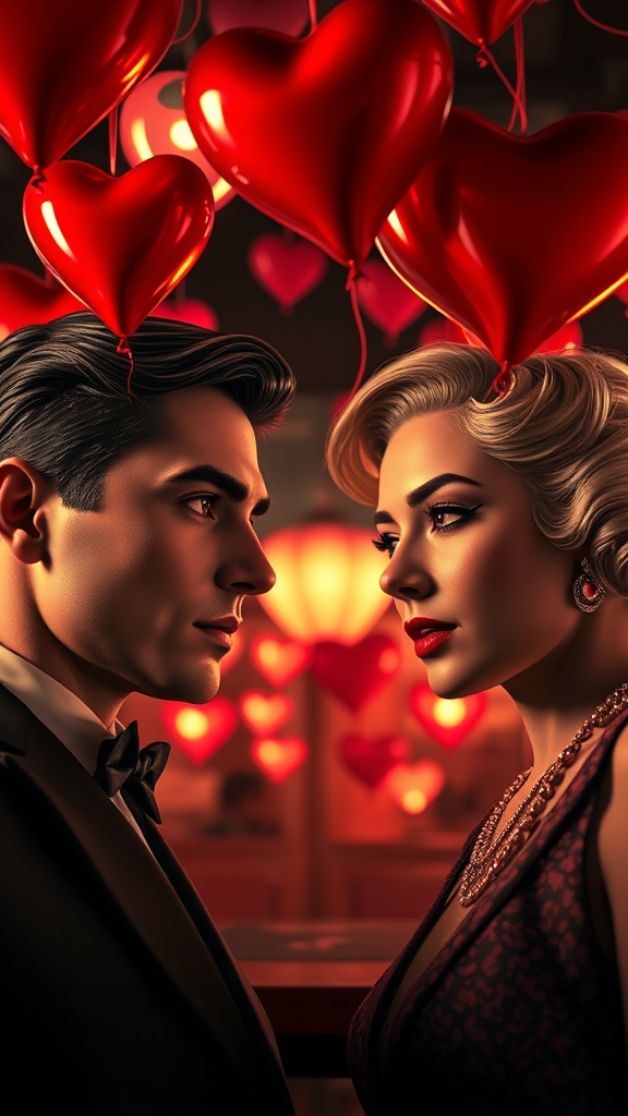 Valentine’s Day celebration, 1920s jazz club ambiance, featuring heart balloons adorning the ceiling. Digital art with background blur, spotlighting a scene of extreme detail and intense focus, with 8K resolution and volumetric lighting. Symmetrical faces reminiscent of James Dean, Audrey Hepburn, Humphrey Bogart, and Marilyn Monroe. The piece is akin to a majestic oil painting by Ed Binkley, Atey Ghailan, and Jeremy Mann, with influences from Studio Ghibli, Gregory Manchess, and Antonio Moro. Trending on ArtStation and CGSociety, the artwork is highly intricate and sharply focused, with a dramatic, photorealistic style by Midjourney and Greg Rutkowski. The scene captivates without distracting elements like anatomic distortions or text interruptions, retaining artistic integrity and avoiding common artistic mishaps like long necks or disfigured forms.