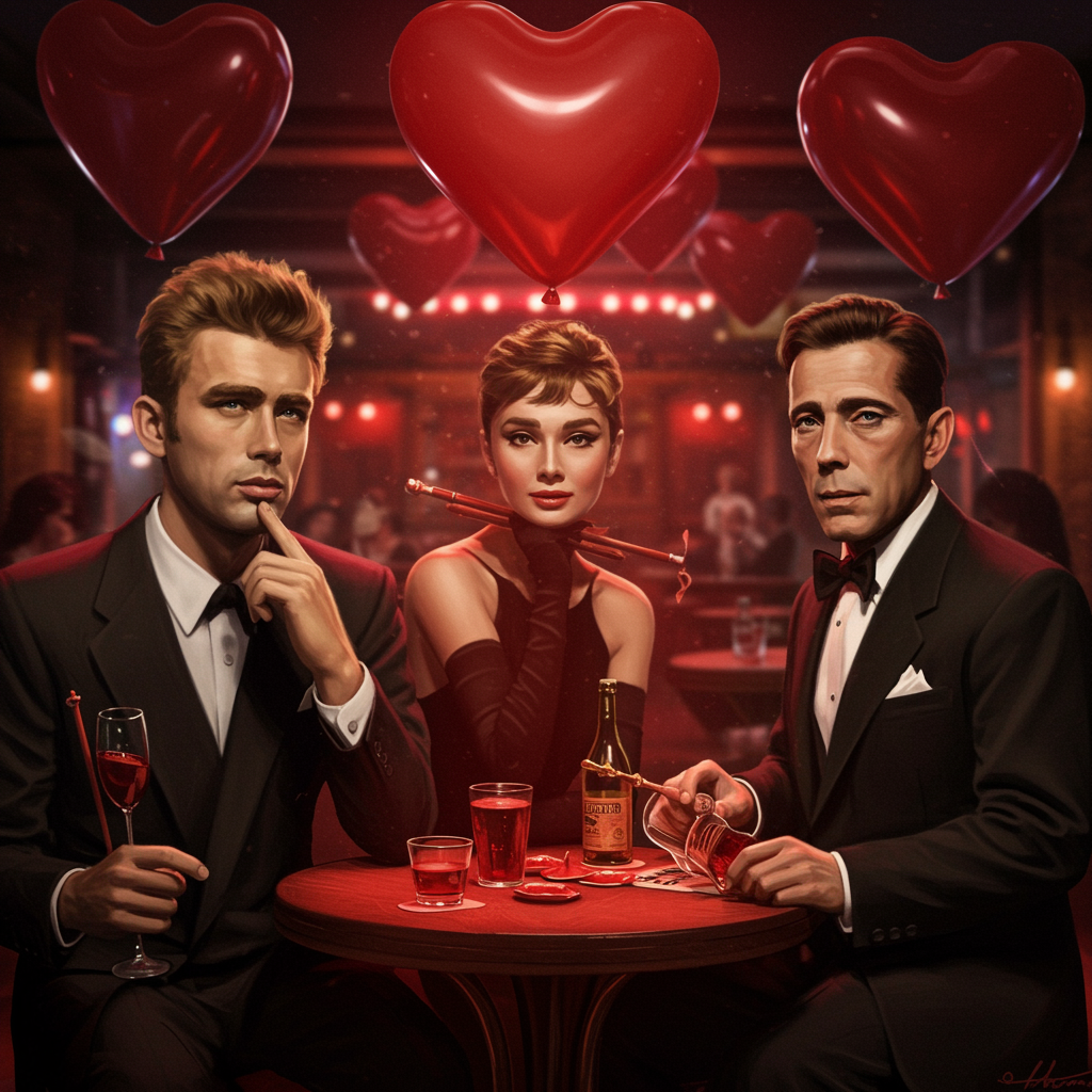 Valentine's Day celebration, 1920s, jazz club ambiance, heart balloons adorn the ceiling, digital art, background subtly blurred, sharp spotlight, extremely detailed, 8K resolution, volumetric lighting, intense and vivid, sharp focus on symmetrical faces featuring James Dean, Audrey Hepburn, Humphrey Bogart, and Marilyn Monroe, capturing the essence of majestic oil paintings by Ed Binkley, Atey Ghailan, Studio Ghibli, Jeremy Mann, Gregory Manchess, and Antonio Moro, trending on ArtStation and CGSociety, intricate, high detail, with dramatic and photorealistic qualities, painted art influenced by Midjourney and Greg Rutkowski. Avoids distorted anatomy such as elongated necks, extra arms or fingers, and ensures clarity and precision in depiction.