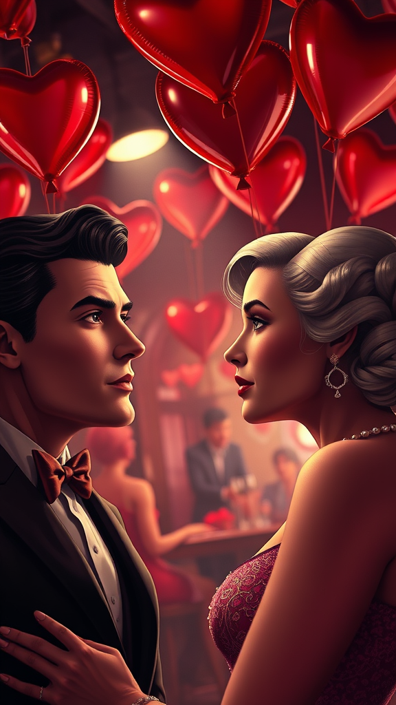 Valentine's Day celebration, 1920s jazz club, heart-shaped balloons adorning the ceiling, digital art capturing a vibrant scene, background gently blurred with a spotlight highlighting the characters, intricate detail in 8K with stunning volumetric lighting, striking sharp focus on symmetrical faces inspired by icons like James Dean, Audrey Hepburn, Humphrey Bogart, and Marilyn Monroe. Majestic oil painting style influenced by Ed Binkley, Atey Ghailan, Studio Ghibli, and the artistic flair of Jeremy Mann, Gregory Manchess, Antonio Moro, trending on ArtStation and CGSociety. The scene radiates a dramatic, photorealistic quality, a captivating blend of creativity and elegance, flowing lines and artistic harmony, capturing an enchanting, timeless moment.