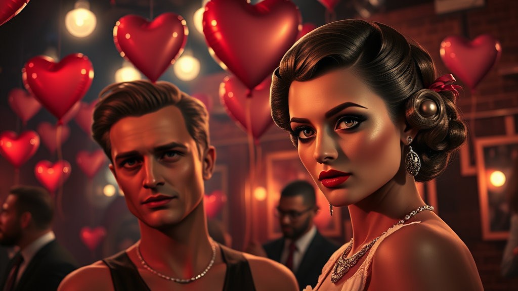 Valentine's Day celebration, 1920s jazz club scene, ArtStation trending, heart balloons adorning the ceiling, digital art with a background blur, dramatically lit with spotlights, extremely detailed, 8K resolution featuring volumetric lighting, intensely sharp focus, symmetrical faces reminiscent of icons like James Dean, Audrey Hepburn, Humphrey Bogart, and Marilyn Monroe. Majestic oil painting styled by Ed Binkley and Atey Ghailan, Studio Ghibli influence, influenced by Jeremy Mann and Gregory Manchess, Antonio Moro, capturing the intricate and high-detail essence, creating a dramatic, photorealistic art piece. Dominated by a romantic and nostalgic atmosphere, capturing the essence of the era with rich textures and vivid colors, avoiding defects like bad anatomy or disfigured features.