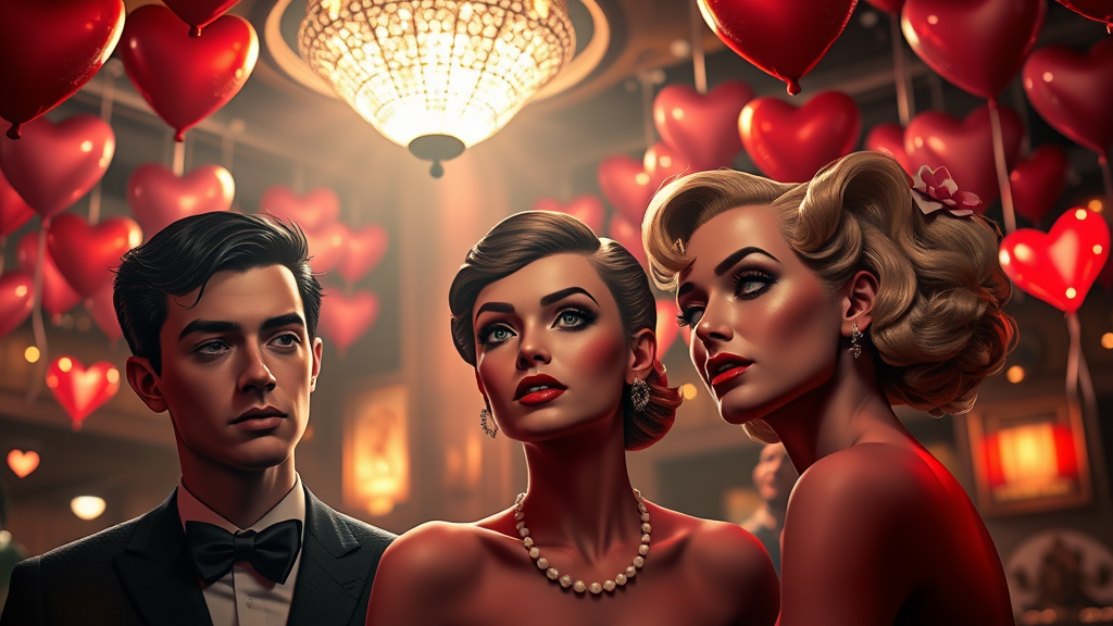 Valentine's Day celebration, 1920s jazz club setting, trending on ArtStation, a ceiling adorned with heart-shaped balloons, digital artwork with background blur, intense spotlight, extremely detailed in 8K, featuring volumetric lighting, sharp focus on symmetrical faces, iconic figures resembling James Dean, Audrey Hepburn, Humphrey Bogart, and Marilyn Monroe, in a majestic style akin to oil paintings by Ed Binkley, Atey Ghailan, Studio Ghibli, Jeremy Mann, Gregory Manchess, and Antonio Moro. Trending on ArtStation and CGSociety, the piece is intricate, highly detailed, sharp-focused, dramatic, and photorealistic, avoiding any anatomical inaccuracies like extra limbs or disfigured features, maintaining a harmonious and captivating composition.