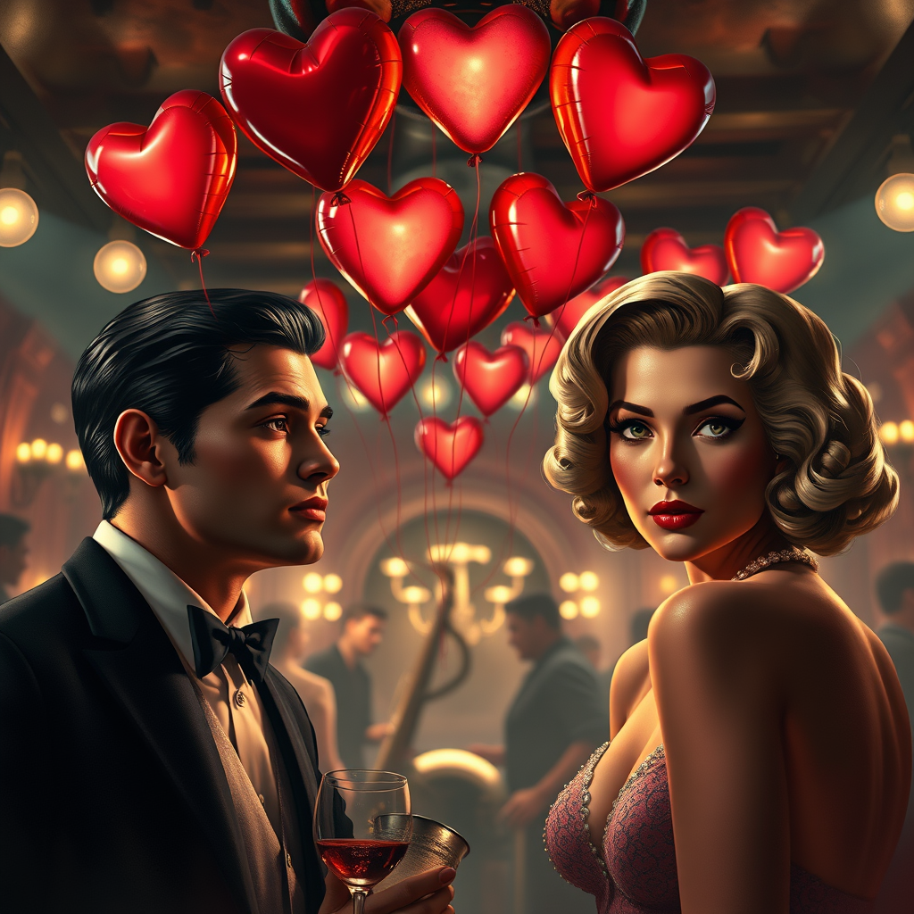 Valentine's Day celebration in a 1920s jazz club, a nostalgic scene trending on ArtStation, adorned with heart balloons on the ceiling. Created through digital art with intense background blur, sharp focus, and striking volumetric lighting. The setting spotlights iconic figures like James Dean, Audrey Hepburn, Humphrey Bogart, and Marilyn Monroe. The artwork echoes a majestic oil painting style inspired by the finesse of Ed Binkley, Atey Ghailan, Studio Ghibli, Jeremy Mann, Gregory Manchess, and Antonio Moro. It exudes intricate, high-detail elements, trending on ArtStation and CGSociety. The composition blends dramatic and photorealistic painting techniques with a modern twist, capturing the captivating essence of the era. The symmetrical faces of the figures reflect elegance and charm, while the ambiance is enhanced by a symphony of warm lights and soft textures, reminiscent of a romantic 1920s night out.