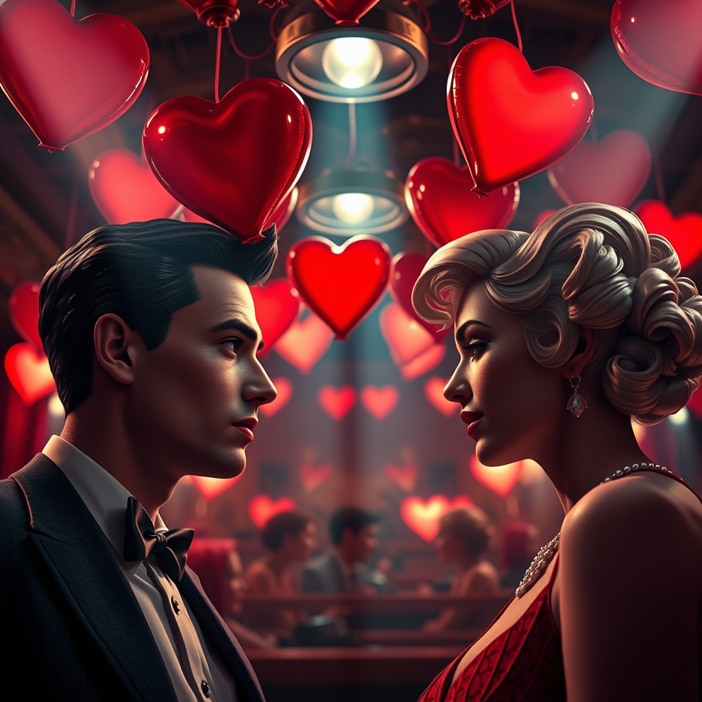 Valentine's Day celebration in a 1920s jazz club, digital art showcasing a romantic scene with heart balloons adorning the ceiling. The setting is intensely detailed in 8K resolution with volumetric lighting and a dramatic atmosphere. A sharp focus highlights symmetrical faces reminiscent of icons like James Dean, Audrey Hepburn, Humphrey Bogart, and Marilyn Monroe, captured in a majestic oil painting style by artists such as Ed Binkley, Atey Ghailan, and Studio Ghibli. Inspired by the works of Jeremy Mann, Gregory Manchess, and Antonio Moro, this imaginative piece trends on ArtStation and CGSociety. The scene is intriguingly intricate, with blurred background and a prominent spotlight, adding a photorealistic touch without distorting anatomy or facial features, ensuring a harmonious blend of creativity and realism.