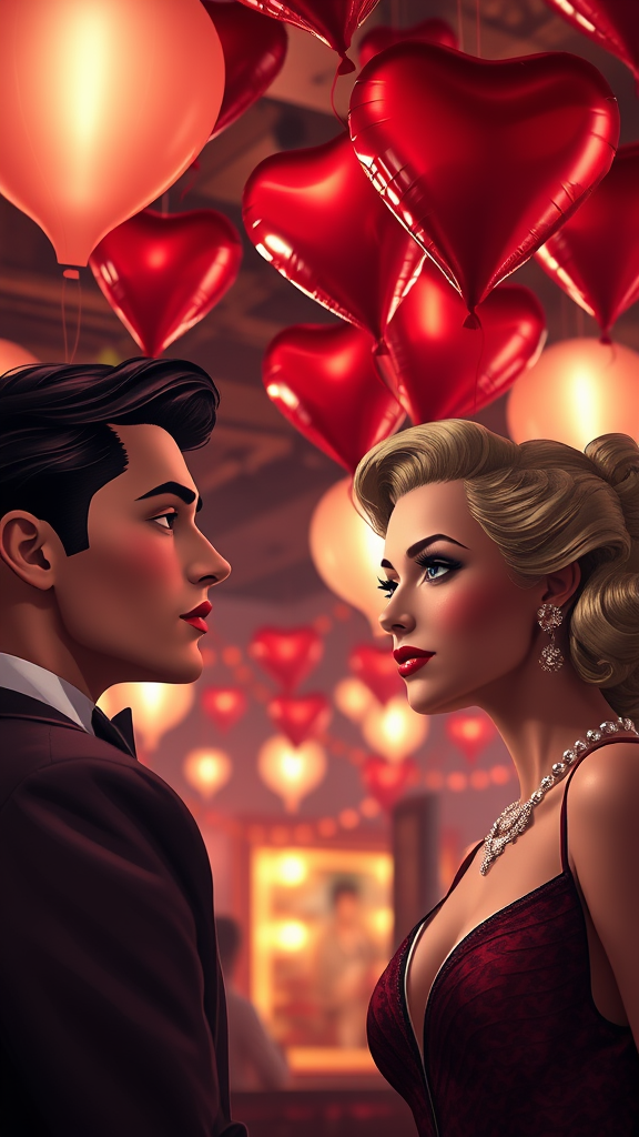 Valentine's Day celebration in a 1920s jazz club, digital art style trending on ArtStation featuring elegant heart balloons adorning the ceiling, a background of blurred lights and vibrant colors, spotlighting central figures with symmetrical faces inspired by James Dean, Audrey Hepburn, Humphrey Bogart, and Marilyn Monroe. The scene is depicted with majestic oil painting vibes reminiscent of Ed Binkley, Atey Ghailan, and Studio Ghibli, brilliantly crafted by artists like Jeremy Mann, Gregory Manchess, and Antonio Moro. The artwork captures an intricate, high-detail, photorealistic ambiance, with intense, sharp focus and dramatic, volumetric lighting creating an 8K resolution visual experience that echoes the trending movements on ArtStation and CGSociety, resulting in a sophisticated, captivating masterpiece.