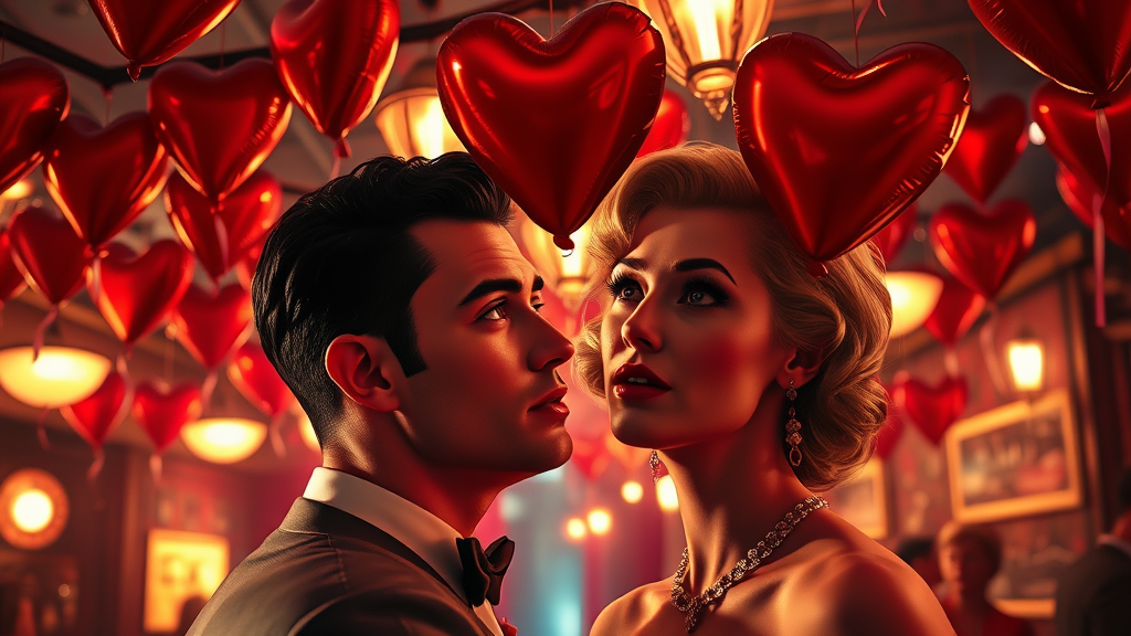 Valentine's Day celebration, roaring 1920s jazz club ambiance, trending on ArtStation, heart balloons adorning the ceiling, stunning digital art, background elegantly blurred, focused spotlight, exquisitely detailed, 8K resolution, immersive volumetric lighting, vibrant and dynamic, sharp focus, perfectly symmetrical faces, inspired by icons like James Dean, Audrey Hepburn, Humphrey Bogart, Marilyn Monroe. This scene echoes a majestic oil painting by the likes of Ed Binkley and Atey Ghailan, with a touch of Studio Ghibli's whimsical artistry. Evokes the dramatic, intricate style of Jeremy Mann, Gregory Manchess, and Antonio Moro, currently trending on CGSociety. The artistry is intricate and of high detail, maintaining sharp focus and dramatic flair. The photorealistic painting captures the essence of Midjourney's elegance and Greg Rutkowski's mastery, avoiding blurry, distorted features and ensuring clear, aesthetically pleasing anatomy and composition.