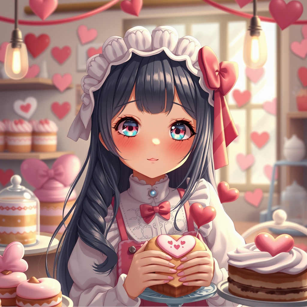 Valentine's Day embodied as a charming girl, blending elements of fantasy and sweetness, captured in an ultra-detailed digital illustration. Imagine a whimsical character designed by Artgerm, infused with the storytelling charm of Studio Ghibli and the vibrant creativity of DeviantArt. Her features are sharply focused and meticulously rendered, reminiscent of Alexei Vinogradov's style, set against the cozy warmth of a delightful bakery scene, adorned with heart-shaped confections and gentle pastel hues.