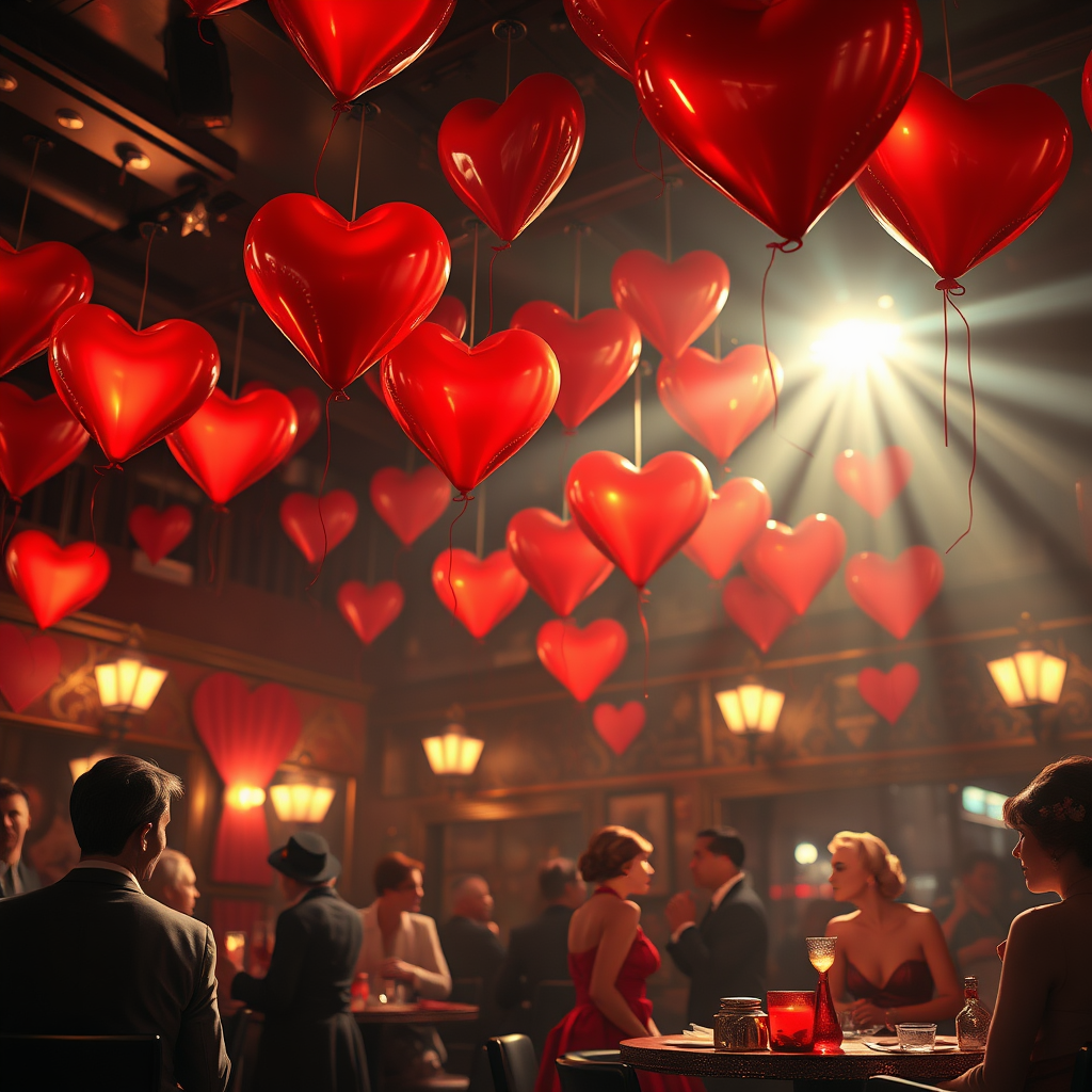 Valentine's Day extravaganza in a 1920s jazz club, heart-shaped balloons adorning the ceiling, digital art with a dreamlike background blur and striking spotlight. Envision an exceptionally detailed 8K scene with volumetric lighting, featuring timeless figures like James Dean, Audrey Hepburn, Humphrey Bogart, and Marilyn Monroe, brought to life in a majestic, intricate oil painting style. The setting captures the blend of elegance and nostalgia, inspired by Ed Binkley, Atey Ghailan, Studio Ghibli, Jeremy Mann, Gregory Manchess, and Antonio Moro, trending on ArtStation and CGSociety. The composition boasts high detail and sharp focus, cultivating a dramatic, photorealistic aura—an extraordinary blend of past and present, with a harmonious balance of symmetry and grace. The art conveys a seamless moment caught in time, capturing the essence of celebration without distortions or anomalies.
